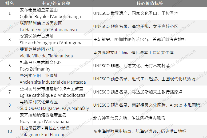 本文由** 「探索马达加斯加」专家组** 基于 UNESCO 世界遗产 / 预备名录、ONTM 国家旅游官方平台权威认证、地方官方旅游机构与公开文化保护资料,再结合历史代表性、全国分布、文化辨识度和现实到访价值进行综合排序。